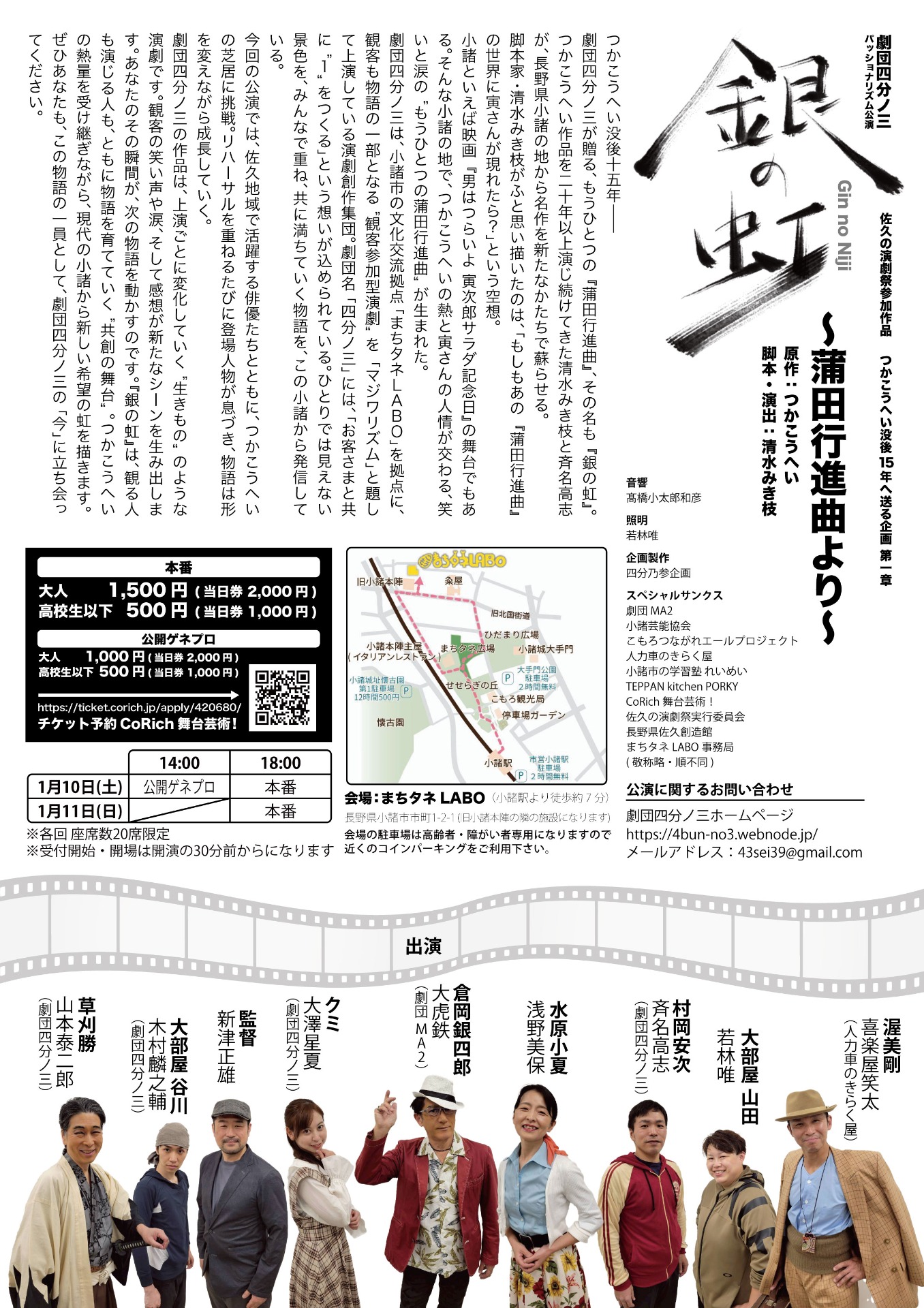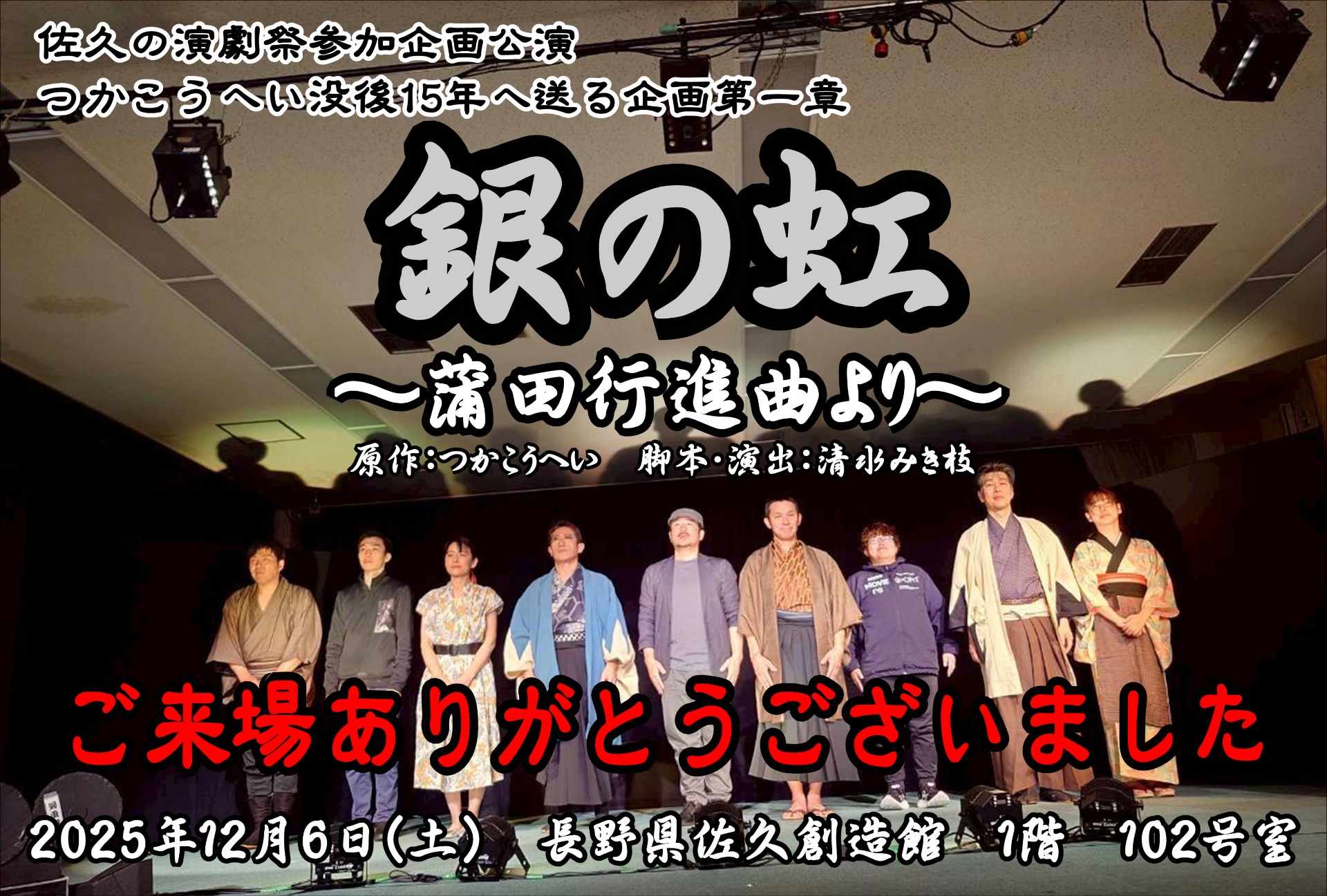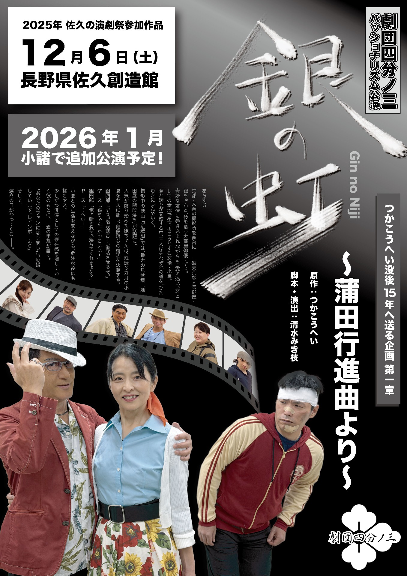 劇団四分ノ三の作品は、上演ごとに変化していく"生きもの"のような演劇です。観客の笑い声や涙、そして感想が新たなシーンを生み出します。あなたのその瞬間が、次の物語を動かすのです。『銀の虹』は、観る人も演じる人も、ともに物語を育てていく"共創の舞台"。つかこうへいの熱量を受け継ぎながら、現代の小諸から新しい希望の虹を描きます。